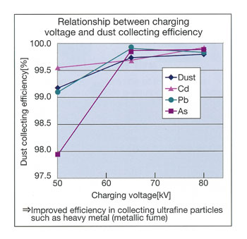 特に間欠荷電を行うことにより、集塵性能を維持しながら、サイリスタ方式と比べ約40%の消費電力量(CO2発生量)の削減が期待できます。